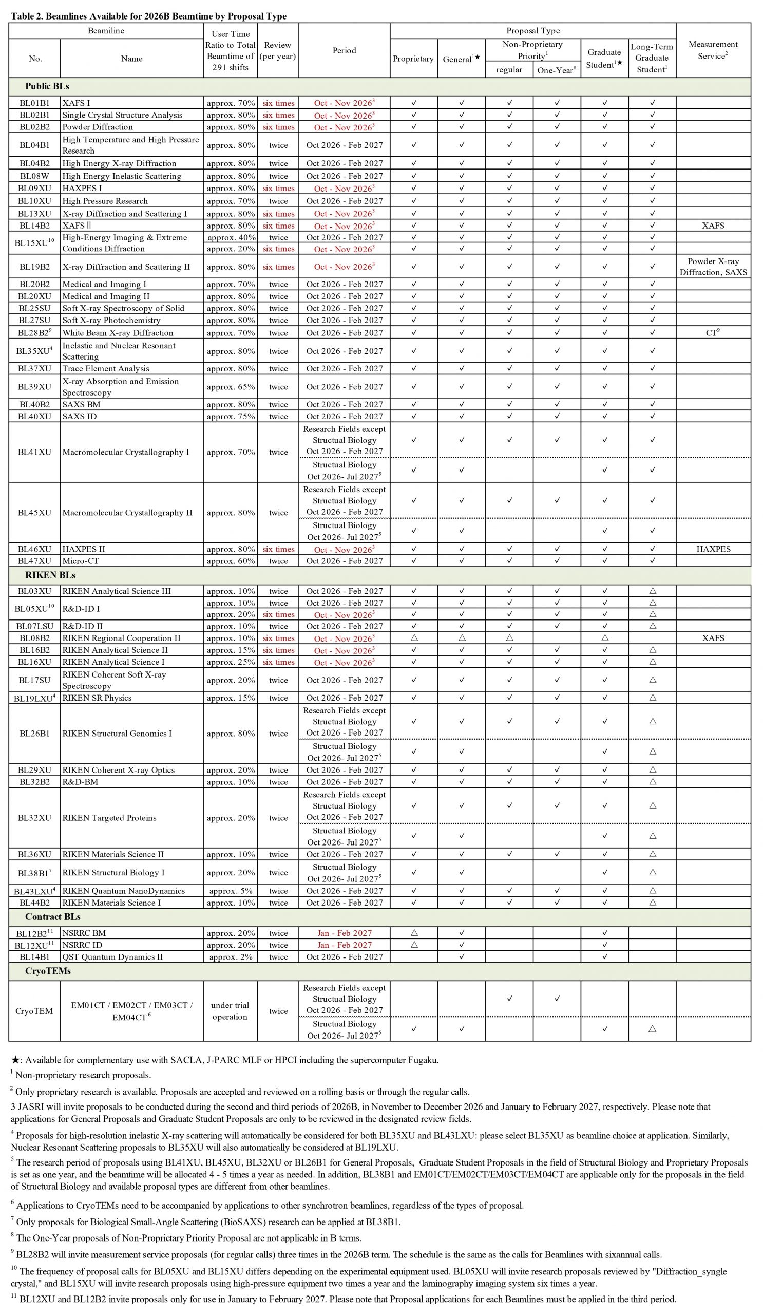 1.2 Types of Research and Proposals Available for 2026B Beamtime and Online Submission Deadline for Proposals (Japan Time)