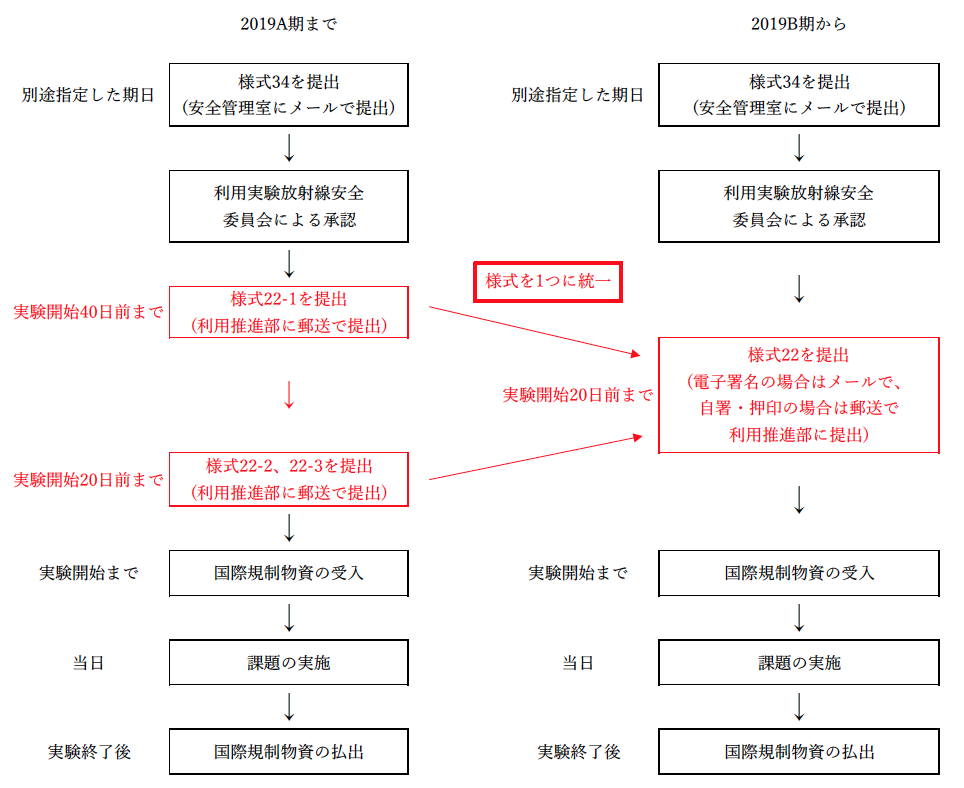 2019A 期まで、国際規制物資(核燃料物質)を使った実験を行う場合は、様式 34(放射性試料使用実験承認申請書)を別途指定した期日に提出していただき、利用実験放射線安全委員会の審査を経た後、様式 22-1(国際規制物資使用計画書)、22-2(核燃料物質持込申請書兼承認書)、22-3(核燃料物質返送承諾書)の 3種類の書類をご提出いただいておりました。2019B 期より提出書類の簡略化とペーパーレス化を目的として、様式 22-1~22-3 の 3 つを様式 22 に統合し、Adobe Acrobat または Acrobat Reader で利用可能な電子署名を使った申請に対応することといたしました。つきましては、下記の改定の概要図、および記入例をご確認いただき、ご記入いただきますようお願い申し上げます。ご不明な点がございましたら、JASRI 安全管理室にお問い合わせいただきますようお願い申し上げます。