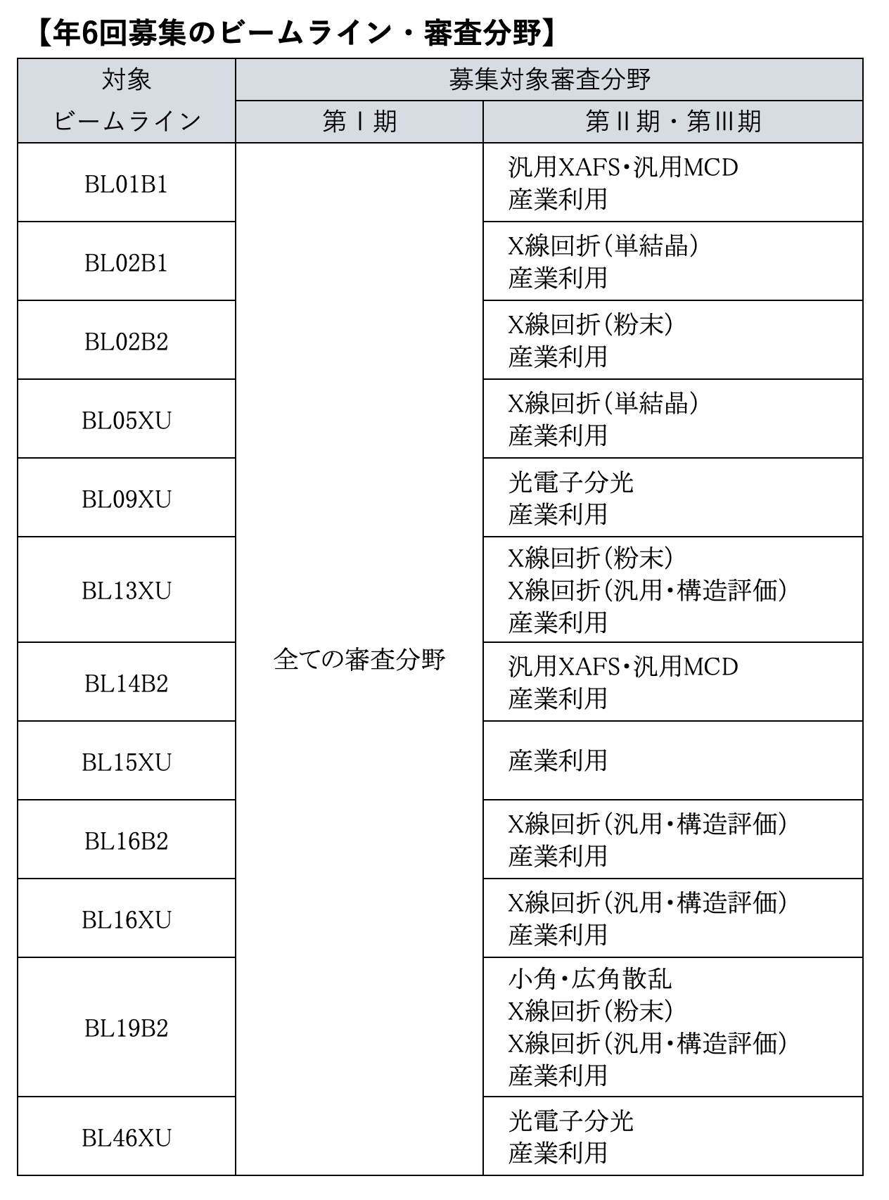 (注意)年6回募集ビームラインにおいては、各期および各ビームラインで募集対象となる研究課題の対象審査分野が限定されます。以下の表をご確認ください。