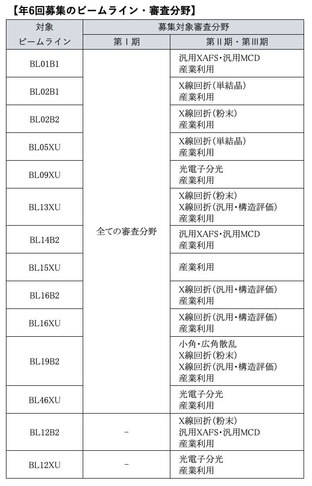 - 年6回募集の対象ビームラインは、BL01B1, BL02B1, BL02B2, BL05XU, BL09XU, BL13XU, BL14B2, BL15XU, BL16B2, BL16XU, BL19B2, BL46XUです。今回の募集は、2026B第Ⅰ期(2026年10月上旬~11月上旬頃)に利用する課題を対象とします。