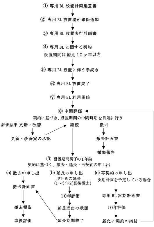 延長をご希望の際には、利用状況等の評価および延長理由・延長期間中の計画の審査を受けていただきます。延長期間は5年を限度としており、延長期間終了後は、撤去または「再契約」(10年以内)のいずれかを選択していただくこととなります(再度の延長は、原則、認められません)。 - 再契約をご希望の場合