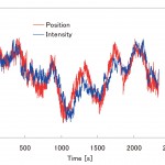 図6 BL29XUにおいて測定されたビーム位置と強度の時間変動。アンジュレータ1次光ピークエネルギーは10 keV、Si111分光器のエネルギー設定はE = 10 keVである。測定されたビーム強度変動はσ = 8.8 × 10-3、ビーム位置変動はσ = 1.74 µmである。但しビーム強度変動を強調するために分光器第一結晶を平行配置からずらして回折強度を極大の半値として測定した。