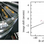 図8プロットは、アライメント・バーの動径方向の移動量と、それによる結像位置の変化量の相関をとったものである。この関係は計算することができ、これを実線で示した。実験値は計算値に沿って相関を示すものの、結像位置方向に0.5分角程度の分散を持つ。これはデータにつく誤差よりも大きく、バー位置の制御に対する不感領域に相当するものと考えられる。事実、反射鏡は多少のクリアランスを持って溝に収まっている。さらにこの調整は、隣合うバー同士で完全に独立ではないことも一因と思われる。
