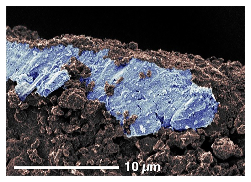 図2 リュウグウの砂表面に発達した塩結晶の脈。二次電子像の擬似カラー画像。