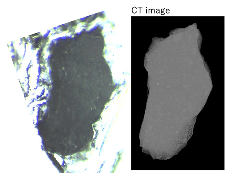 図3 インジウムに固定したリュウグウ粒子の光学顕微鏡画像(左)とトモグラフィーのデータから再構成した三次元像。