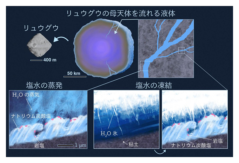発見された鉱物はいずれも水に非常に溶けやすい性質をもつ塩の結晶である。水に溶けやすいということは、液体が極めて少なく塩分濃度が高くなければ結晶が析出できなかったと推定される。そのため筆者らは、リュウグウの砂を作る多くの鉱物が母天体で沈殿したあとに、液体の水が失われる現象が存在し、その際に塩の結晶が沈殿したと考えた(図4)。液体がなくなる現象として考えられる可能性のひとつは、塩水の蒸発である。母天体の内部から表層の宇宙空間へまでつながる割れ目が生まれれば、天体内部の液体は減圧されて蒸発すると考えられる。地球上では大陸内部に取り残された湖が干上がった時に高い濃度の塩水が生じ、ナトリウム炭酸塩や岩塩などが析出することが知られている。これらは「蒸発岩」と呼ばれており、リュウグウ母天体でも蒸発岩が生まれたのかもしれない。もうひとつの可能性は、液体の凍結である。母天体を温めていた放射性元素が乏しくなると天体は冷えてゆき、塩水は徐々に凍結するはずである。塩水に溶けた陽イオンや陰イオンは氷には取り込まれにくいので、凍結が進むと残された塩水の濃度は高くなる。すると濃い塩水からは塩結晶が析出する。凍結した氷はやがて現在に至るまでに宇宙空間へと昇華してしまったと考えられられる。現在のリュウグウに大量の液体は見られず、そしてリュウグウの砂つぶも湿っていることはなく、母天体を流れたはずの液体の水がどのように失われたのか分かっていなかった。今回の研究により、リュウグウの母天体では蒸発、もしくは凍結によって液体の失われる現象が起こったことが初めてわかった。また、この考察が示唆する重要な点は、急激な水の消失が起こるほど、もともと母天体は水に富んでいたという点である。つまり、母天体の材料となった氷の、無機物質に対する量比が高かったことを示唆している。