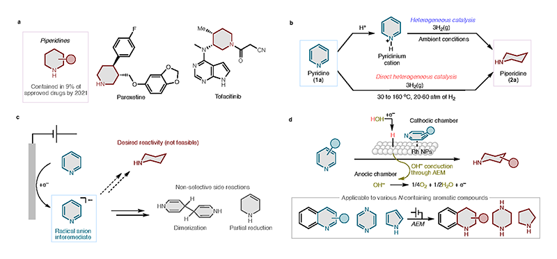 、意外なことに現在に至るまで効率的かつ選択的に、ピリジン類をピペリジン類へと変換する電気化学な手法は存在しなかった。この原因として、一般的な電解反応では電極からピリジン環に電子が注入されるステップから反応が開始するが、ここで形成されるラジカルアニオン種が極めて不安定であるため、プロトン化を受ける前に2量化などの副反応が起こってしまう(図1c)。このように電子注入とプロトン付加が段階的に進行する反応機構において、6e–/6H+ の受け渡しが必要となるピリジン→ピペリジンの変換は極めて難易度が高いと言える。