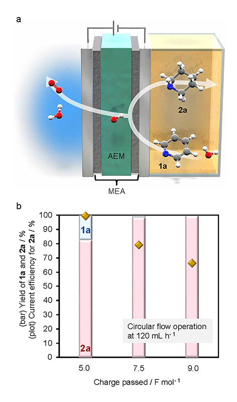 図2.ピリジンの電解水素化 (a) AEM型リアクターを用いた反応系の概略、(b) 定電流電解におけるピペリジン生成量と電流効率の通電量依存性。文献1より一部改変し掲載。