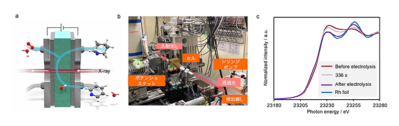 図3.in situ XAFS測定。(a) in situ XAFS測定に用いた電解セルの概観、(b) BL14B2において構築した実験のセットアップの写真、 (c) 得られたRh K端XANESスペクトル。文献1より一部改変し掲載。