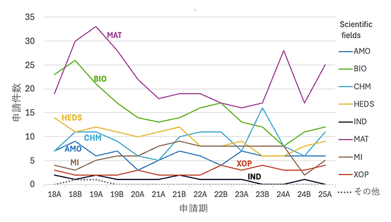 例えば、図1を見ていただきたい。これは、SACLAに提案のあった課題数の分野別数の2018年からの推移を示している。これを見ただけでも分野における変化が出ていることがわかる。この推移は、その時の世界の研究動向、マシンの最新化動向、計測器などの開発動向などが影響した結果となっているが、その状況も選ぶ側のPRCは把握しておく必要がある。そのため、現在のPRC委員会では、まず全体会として現在のSACLAの状況、計測器などの開発・準備状況、世界のXFELの動向の情報を共有できるように、理研・JASRI側に協力を行いつつ、各委員の情報の更新を行うようにしている。