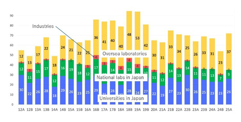 図2には、提案者の所属機関別分布を示している。利用が始まった当時、国内関係者が多かった状況から現在ではほぼ半数を海外からの研究提案となっている。これに対応するようにPRCでは海外レビューアーを行い、海外センスでの審査もお願いしている。ただ、対面を基本として行っているPRC委員会では、国内にいる委員のみで日本語を言語に行っている状況にある。これは、より国内状況を把握しながら選考をお願いしたいという点と、より深い分野間調整などを行うために選択した形となっている。また、この海外からの提案の多さは、同時に海外のマシン状況に影響されることになり、より一層委員の世界のXFEL利用研究の動向理解が必要なことがわかるであろう。