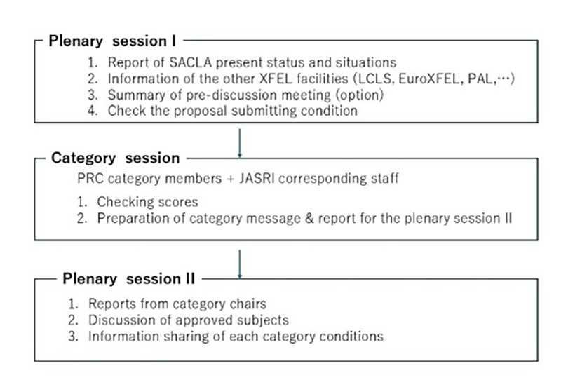 まず、応募された申請書は、技術審査を受けながらレビュアーを決め、書面審査が行われる。審査はA~Dの4段階が等分布数になるように行われる。それら書面審査結果を受け、技術などの状況を鑑み全体PRC会の前に詳細議論が必要な課題があった場合は、プレ議論会がJASRI、PRC委員長、該当するPRC委員で会議を行い、全体会への提案を別途用意する。次に図3 の中段図に示された全体会へ移行する。ここでは、前述した現在のXFEL施設の状況の共有、応募状況の確認、プレ議論会の報告などを行った後に、各カテゴリでの詳細議論を行う。ここでは、各カテゴリ内での研究動向、応募状況、点数分布などを考慮した上での分野内の意思を反映した課題順位を決定、その理由を後半の全体会で明らかにする準備をしていただく。さらに、その後図3の下段図にあるような、PRC委員会からの申請者へのコメント作成、それらをチェックし最終バージョンの決定、さらには、海外レビューアーへの審査結果の報告文などの作成、報告を行っていく。