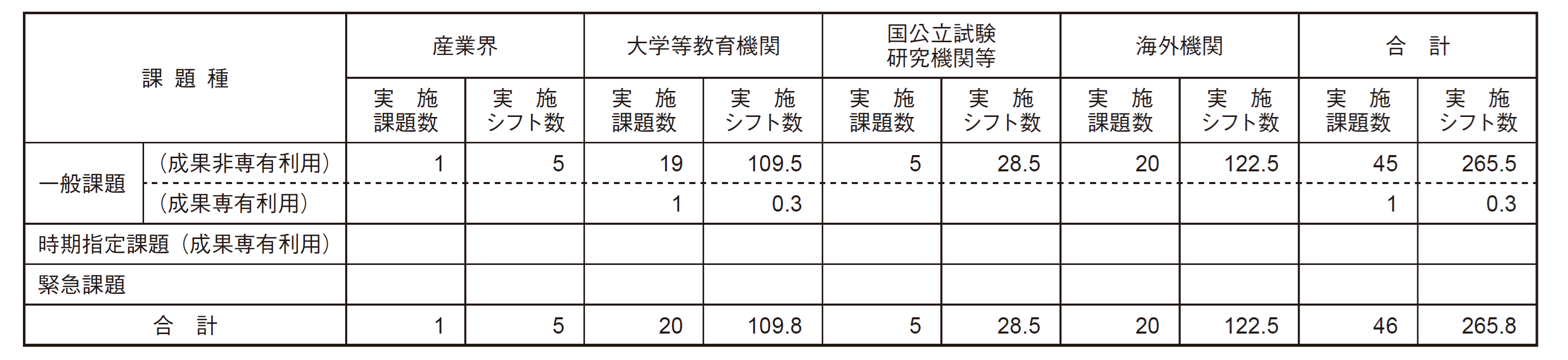 実施課題は、それぞれ表1のとおり国内外機関所属の実験責任者により実施されました。うち、一般課題(成果非専有利用)は45 件、一般課題(成果専有利用)は1件でした。時期指定課題(成果専有利用のみ)および緊急課題の利用はありませんでした。