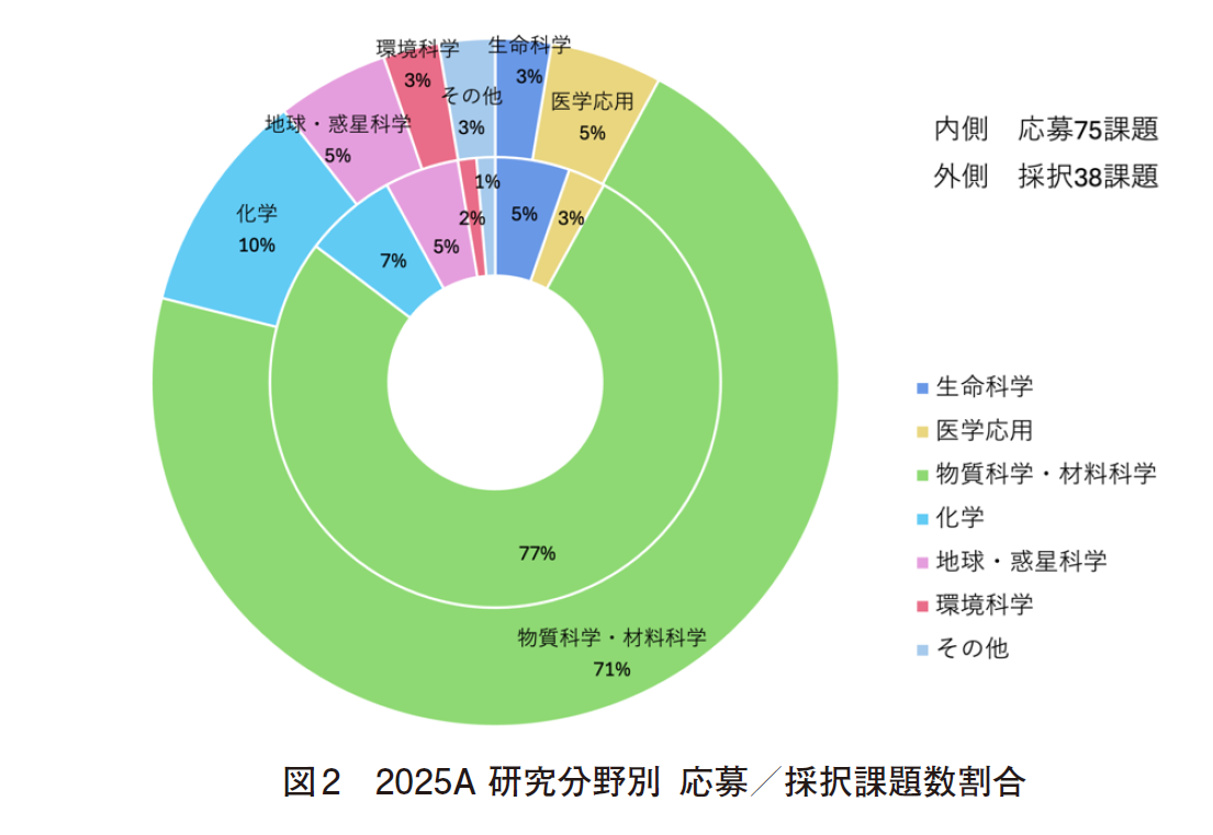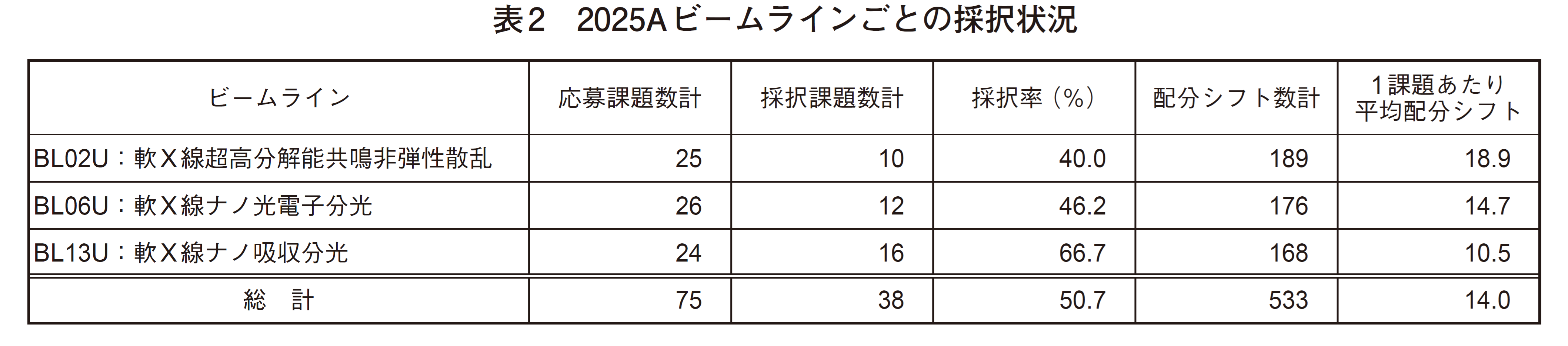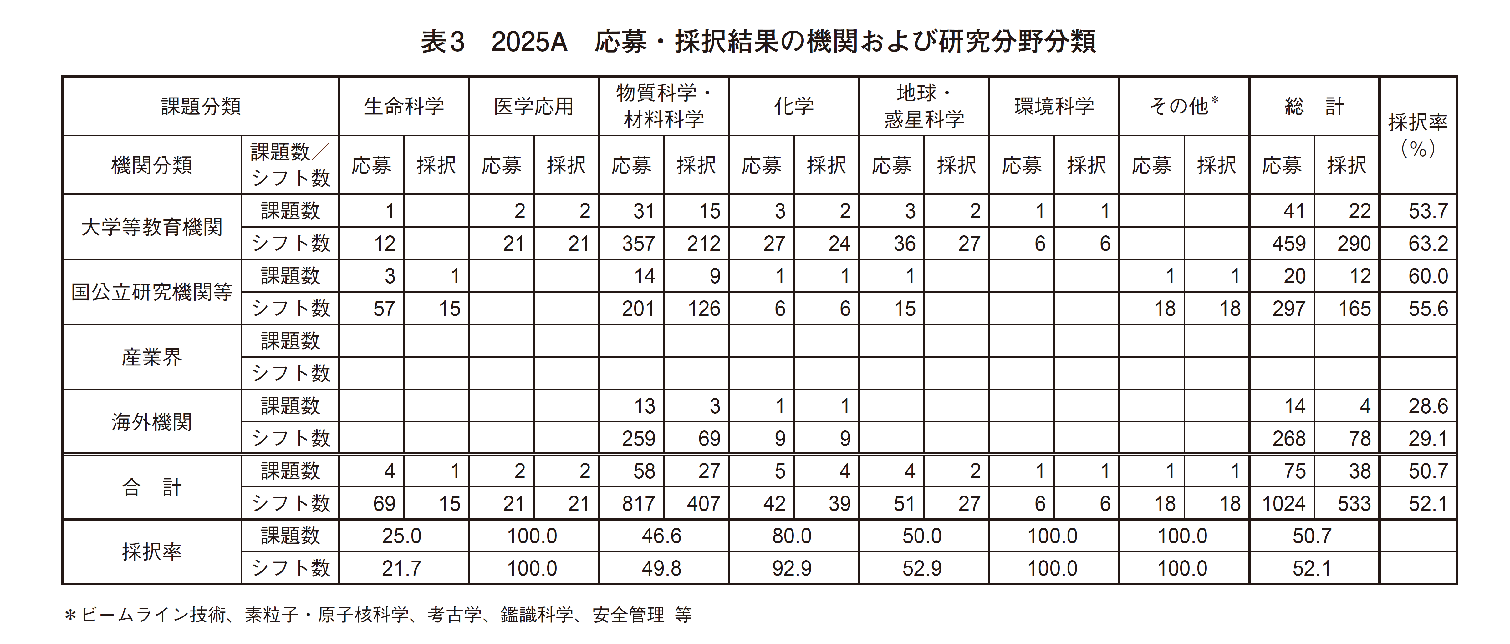 2025A期の新規応募課題数は75、採択課題数は38でした。表1に利用研究課題の応募課題数および採択課題数と採択率(%)を示します。また、表2に応募75課題について、ビームラインごとの応募課題数、採択率および配分シフト数、並びに採択された課題の1課題あたりの平均配分シフト数を示します。表3には応募75課題について、申請者の所属機関分類と課題の研究分野分類の統計を示します。